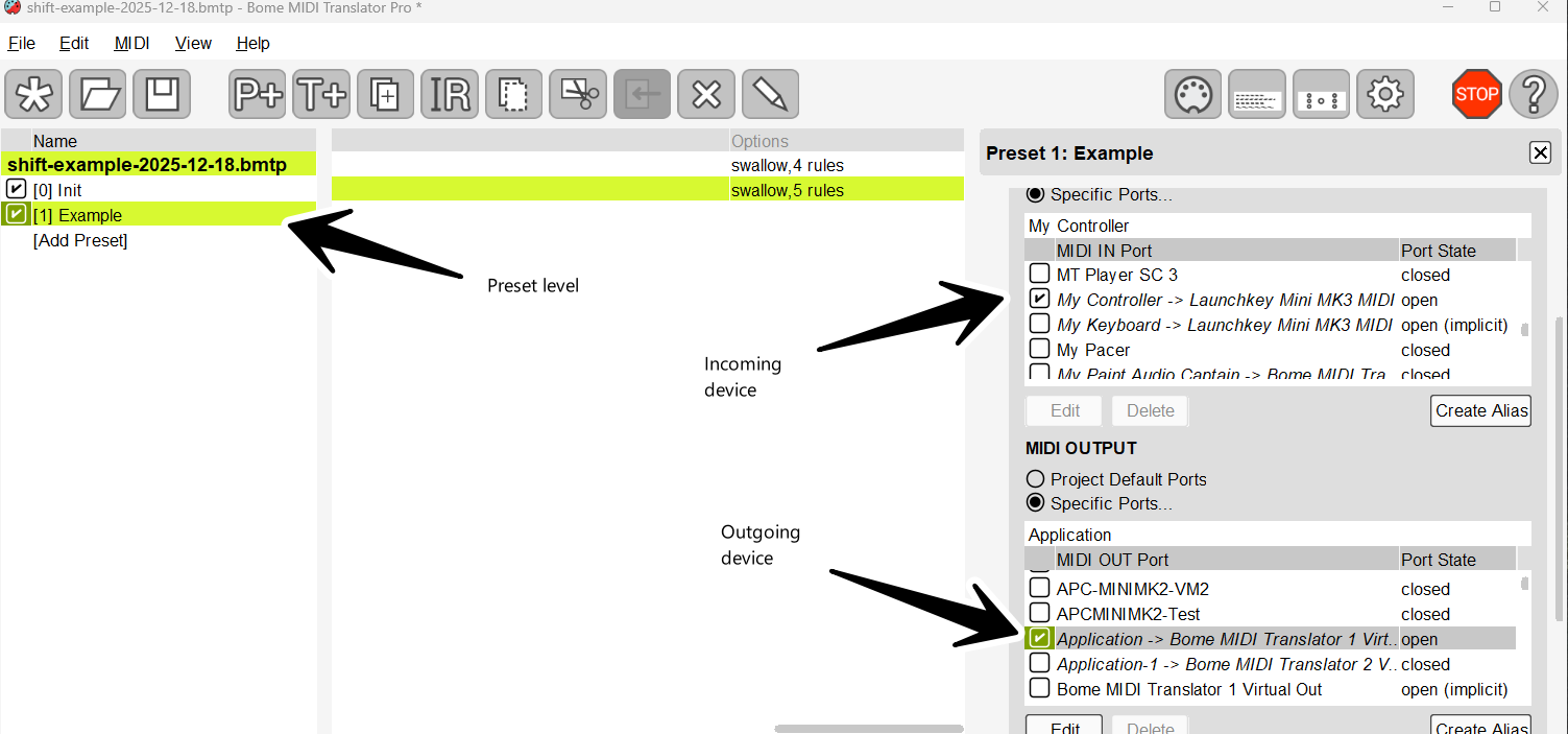 Translator 1.0 (Preset 1 translator 0) handles the shift function and sets or resets the value of the global variable “ga” depending on the value. It does not send any MIDI output so i acts as a shift key. The incoming trigger is CC120 on MIDI CH1 with any value.