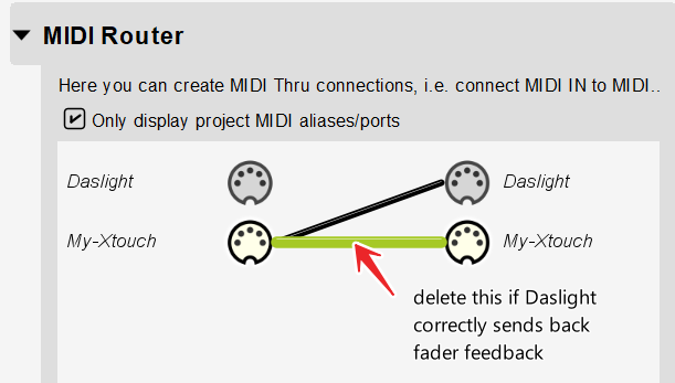 I have a MIDI thru path set to allow for local feedback if Daslight doesn’t send feedback. It can be removed if Daslight is working correctly.