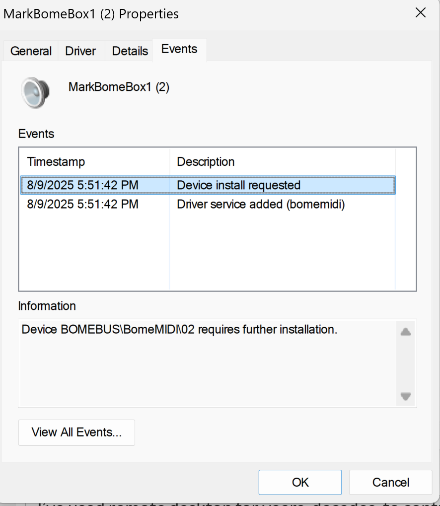 And again, I think it is worth repeating, every single Windows machine I own shows “requires further instillation” under the Events tab for the Bome ports, though the ports do work on those machines.