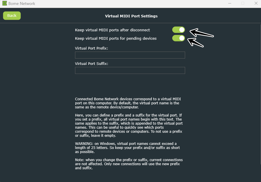 Steve - I did check and the options to keep virtual MIDI ports after disconnect and for pending devices are indeed enabled as you show.