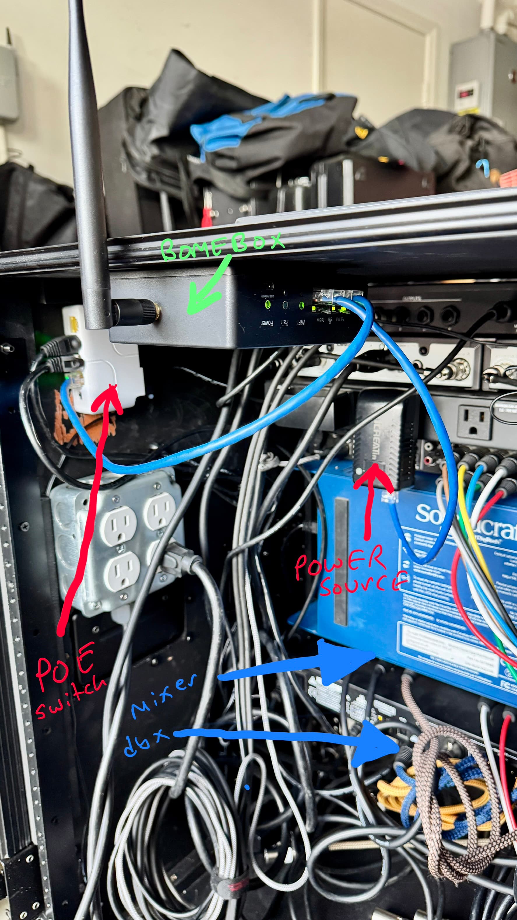I had this thought. I want to use my BOMEBOX as my router (not access point), and have a connected 4 port switch with POE. I would do this, to simplify the power cords in the rack case. So, one power cord goes to the switch, the dbx driverackPA2 connects to the switch (POE out, but doesn’t need POE as the driverack has its own power) and the UI24R connects to the switch, as well. Then, I connect the BOMEBOX (POE in) to one of the switches POE outputs (not the uplink port on the switch). This powers my BOMEBOX which would be my WIFI router and MIDI handler (MIDI for remote changing of my BigSky MX effects processor’s programs and parameters via BOME NETWORK connected iPad).