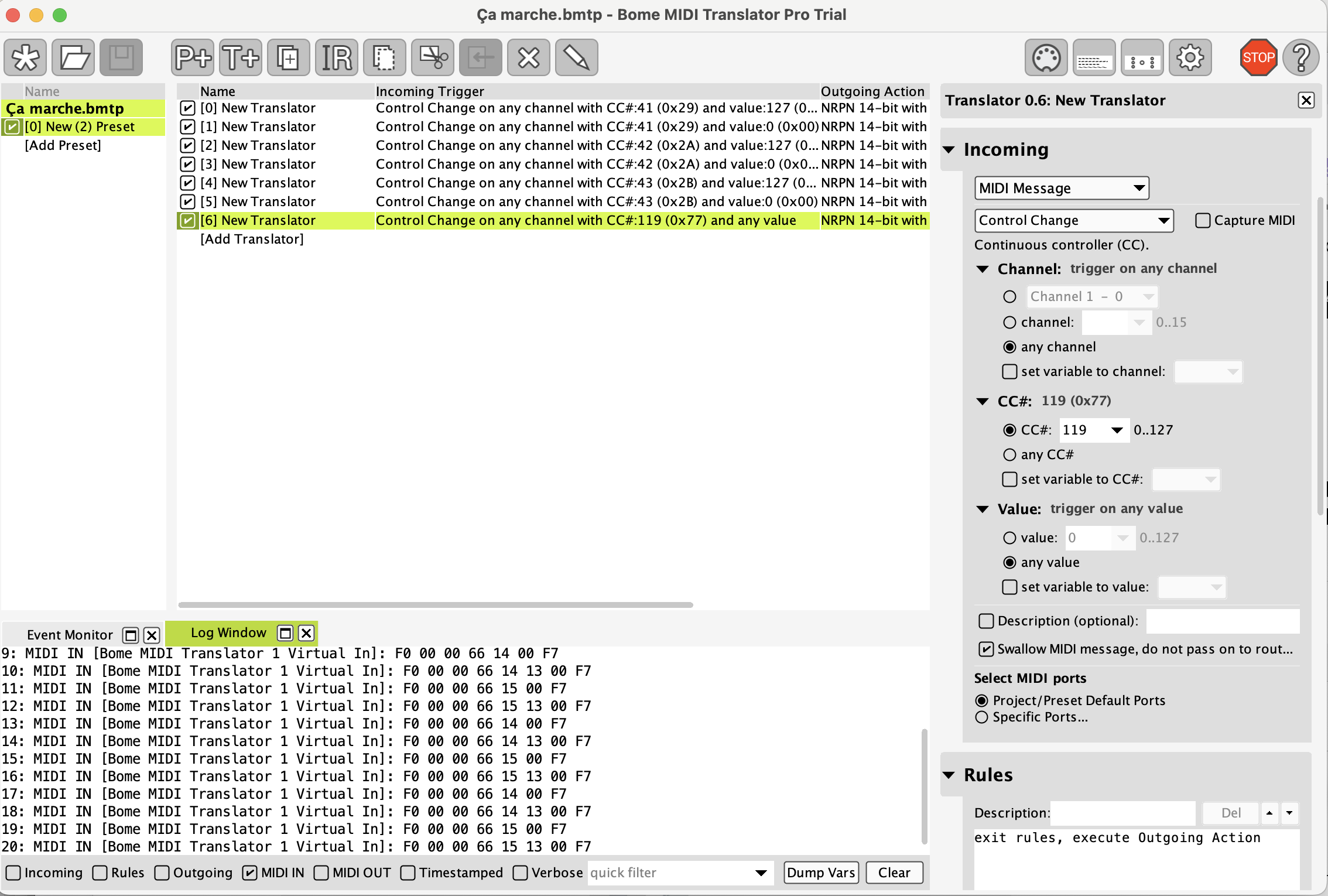 But I don’t understand why I can’t choose any value for Outgoing. If I leave the value at 0, as soon as I trigger my Logic automation, the relevant SQ fader returns to 0 (which already proves that the translator is correctly assigned), but why can’t I allow all values from 0 to 127 to pass through?