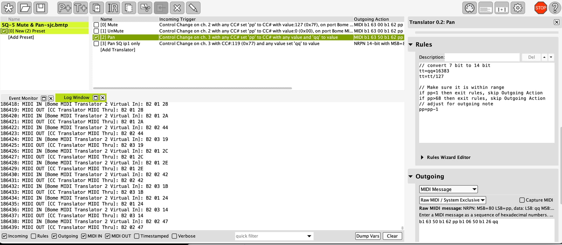 Hi, the log shows the MIDI Message coming from Bome MIDI Translator 1 Virtual Port In? Try either changing it to Bome MIDI Translator 2 Virtual Port In or set translator 0.2 to look at Bome MIDI Translator 1 Virtual Port In.