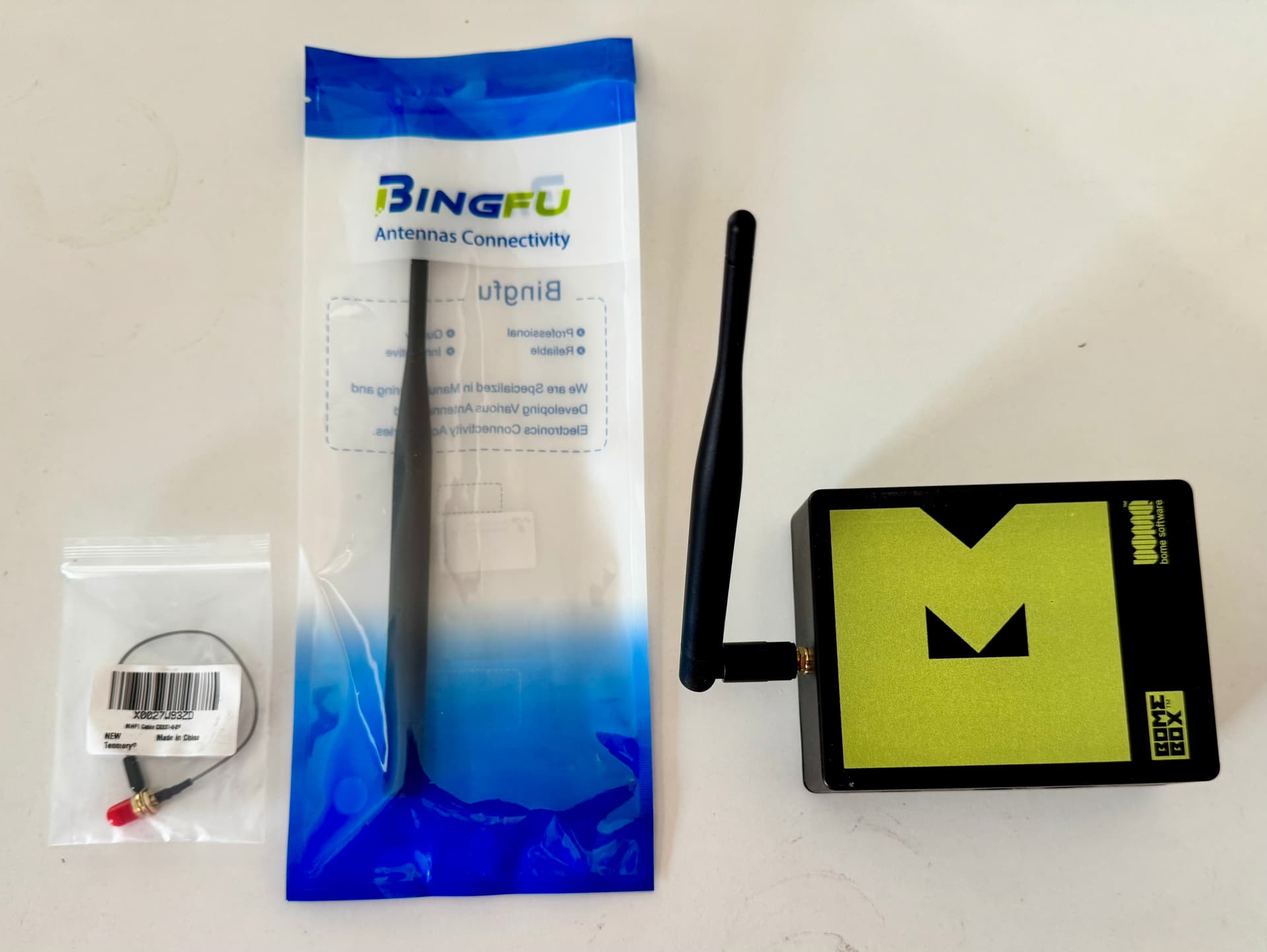 The BomeBox uses a small internal antenna. For many applications like accessing the web config, this is fine. However, if you’re running into connectivity issues, you may install an external, bigger, antenna.