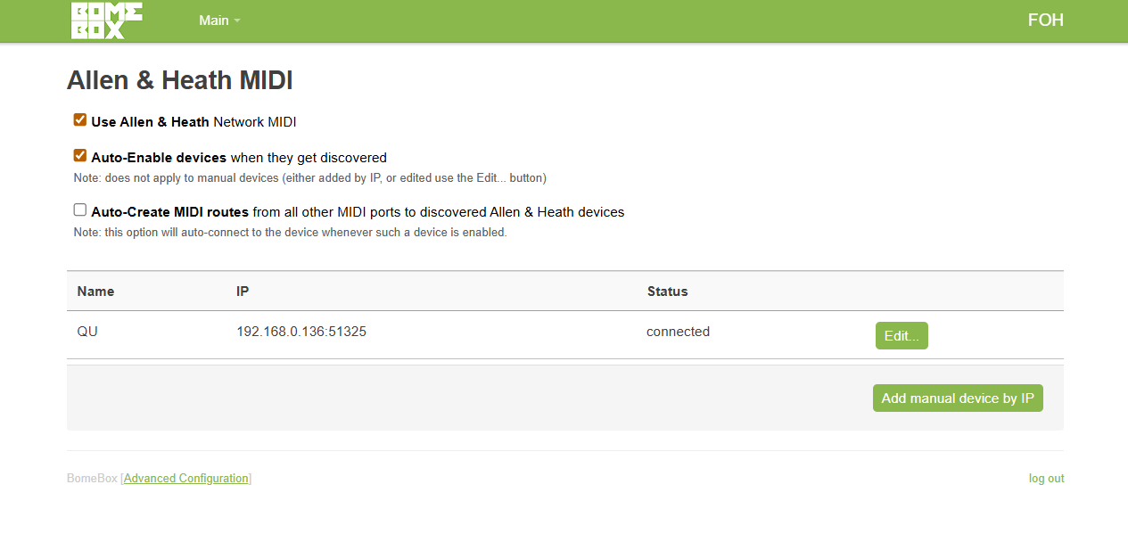 Alternately, if you don’t want to use a computer, you can purchase a BomeBox which supports the Allen&Heath network protoco. You connect to BomeBox useing Bome Network and turn on the Allen & Heath options there. Then BomeBox should discover it and connect to it.