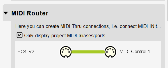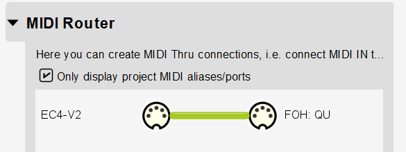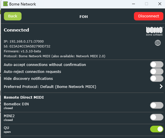 There are also settings there for doing MIDI message conversion and if you wish to use Bome MIDI Translator Pro for conversion instead, you set MIDI Control to “MIDI Thru” as shown below. (except I’m connecting to a QU).