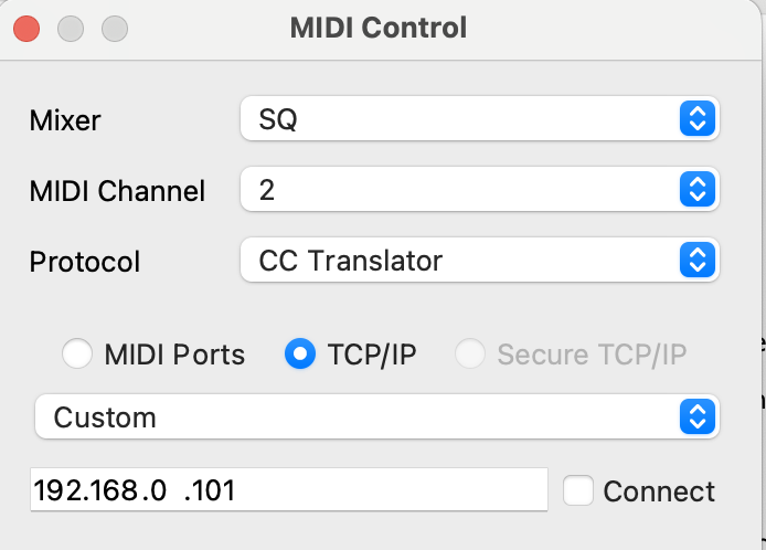 ”A&H MIDI Control” allows communication between my MacBook and SQ-5 via TCP/IP.