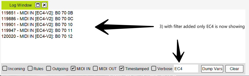 If you want to only monitor in the log window a given MIDI port, you can use a unique port match string in the filter box.