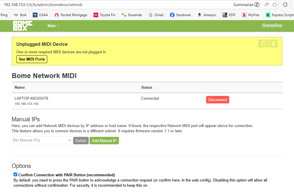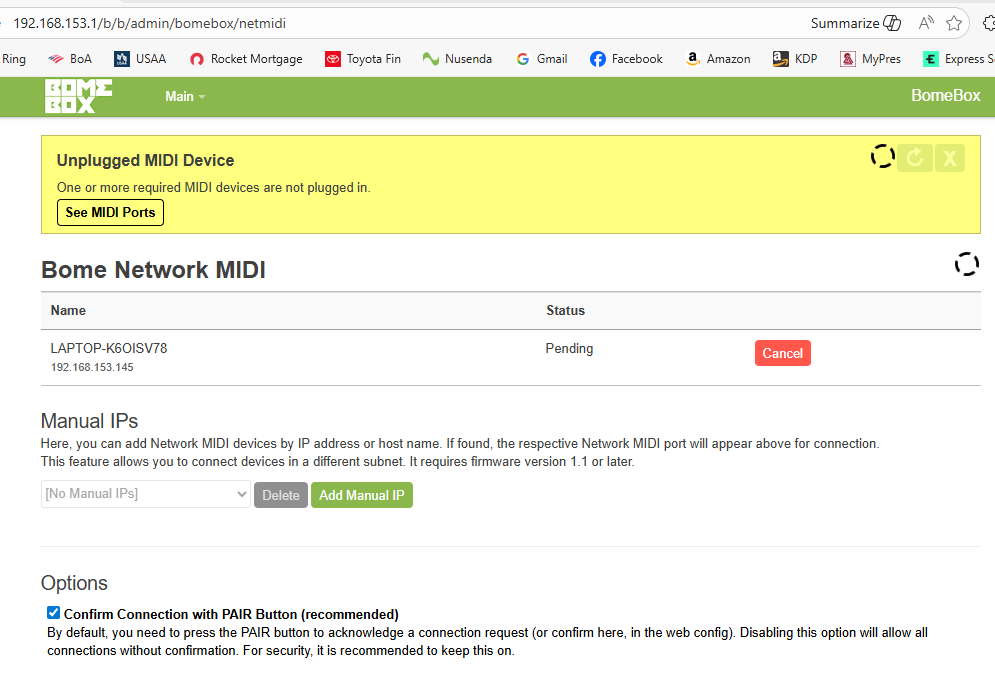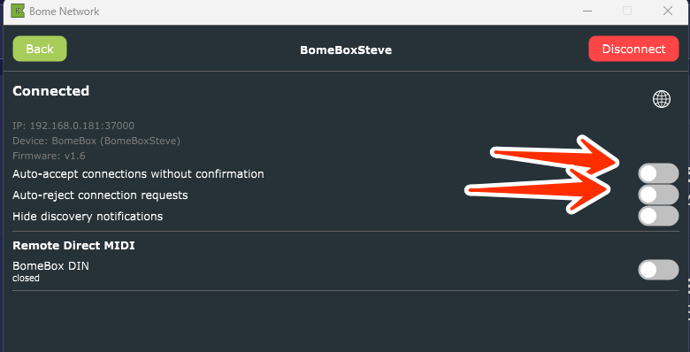 Also you might try going to your Network MIDI 2.0 page on the BomeBox and disconnect anything that shows pending or connected. There shouldn’t be anything there because we don’t yet have Network MIDI 2.0 implemented on the BomeBox.