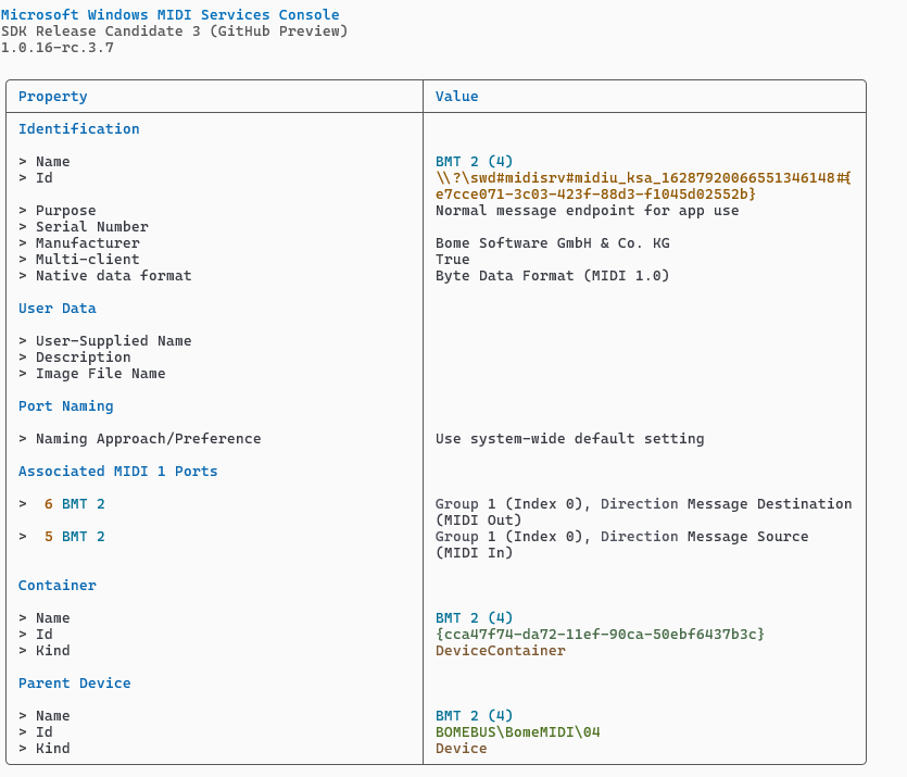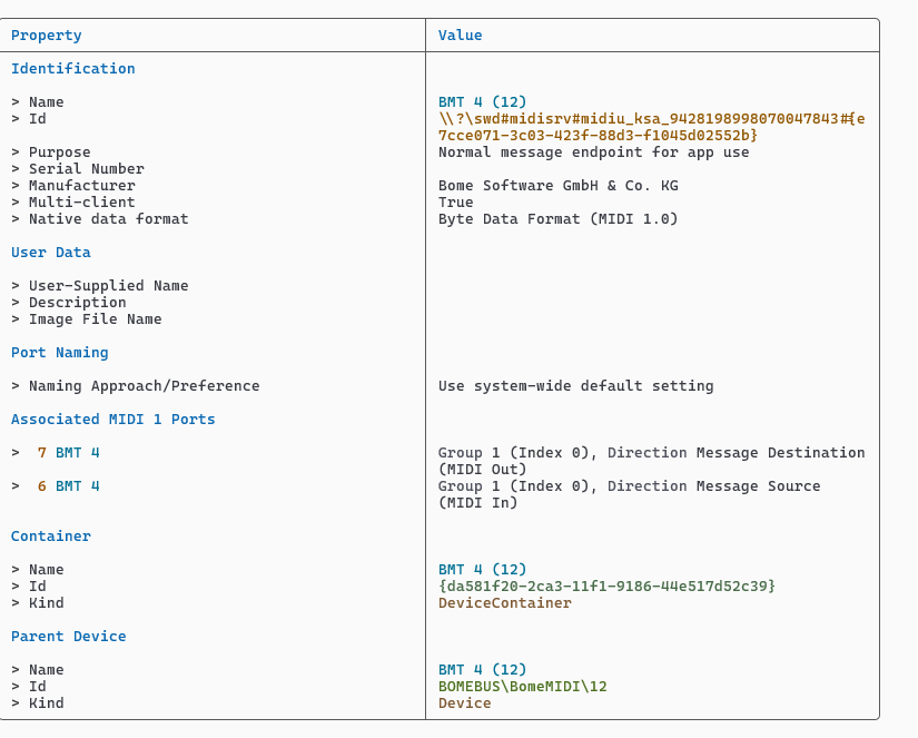 Below is the endpoint properties from Windows Midi Service Console.