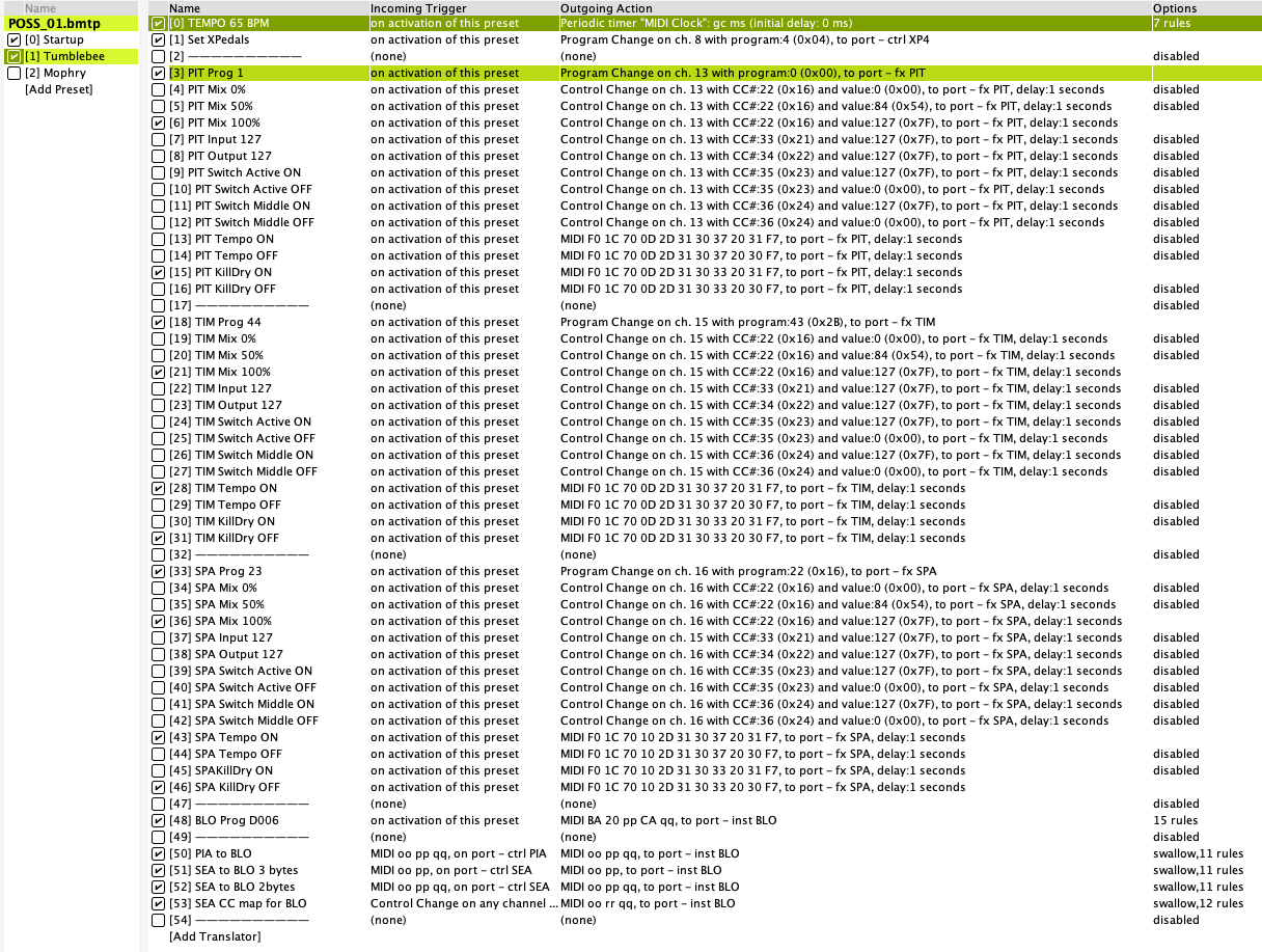 I have read these parts of the manual, although I did not fully understand them. At the moment, we are talking about the initial setup of devices. All translators have incoming ‘on activation of this preset’. For each device, a Program Change is sent first, followed by a handful of parameters. However, I’m not sure whether MTP really runs through all translators in sequence from top to bottom within a setup, even if no incoming actions change the timing, because there are practically none.