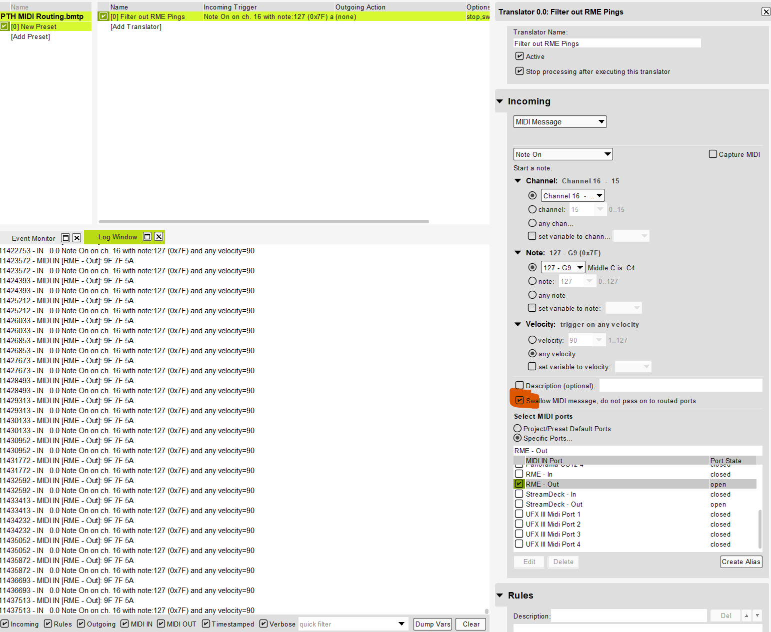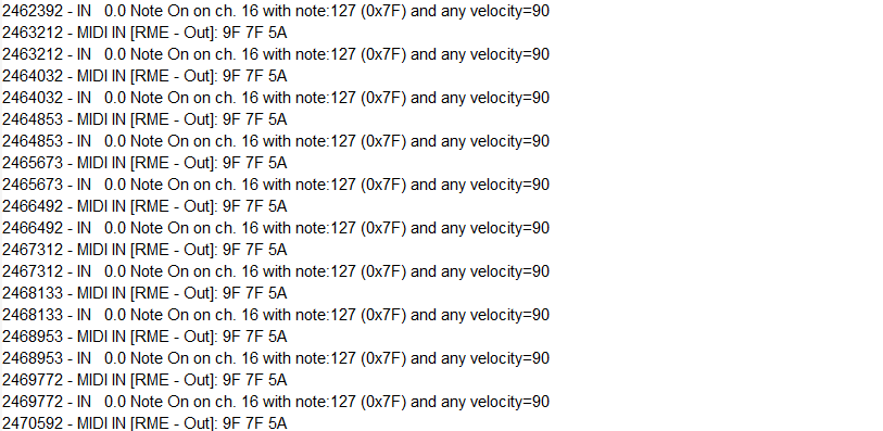 My challenge is not with the capture window, but with the log windows. This is flooded with the RME messages that are produced every 0.5 seconds. It get quite challenging to analyze any other MIDI messages in this window.