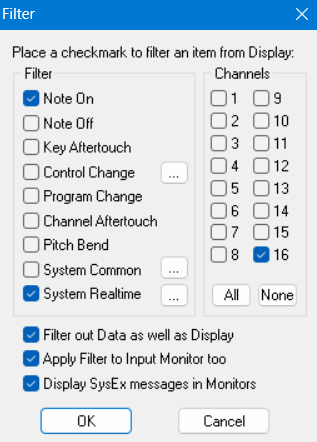 I am in the process of migrating from MIDI-OX to BMT. In MIDI-OX is the flag “Apply Filter not Input Monitor too”. This is exactly what is want to emulate.
